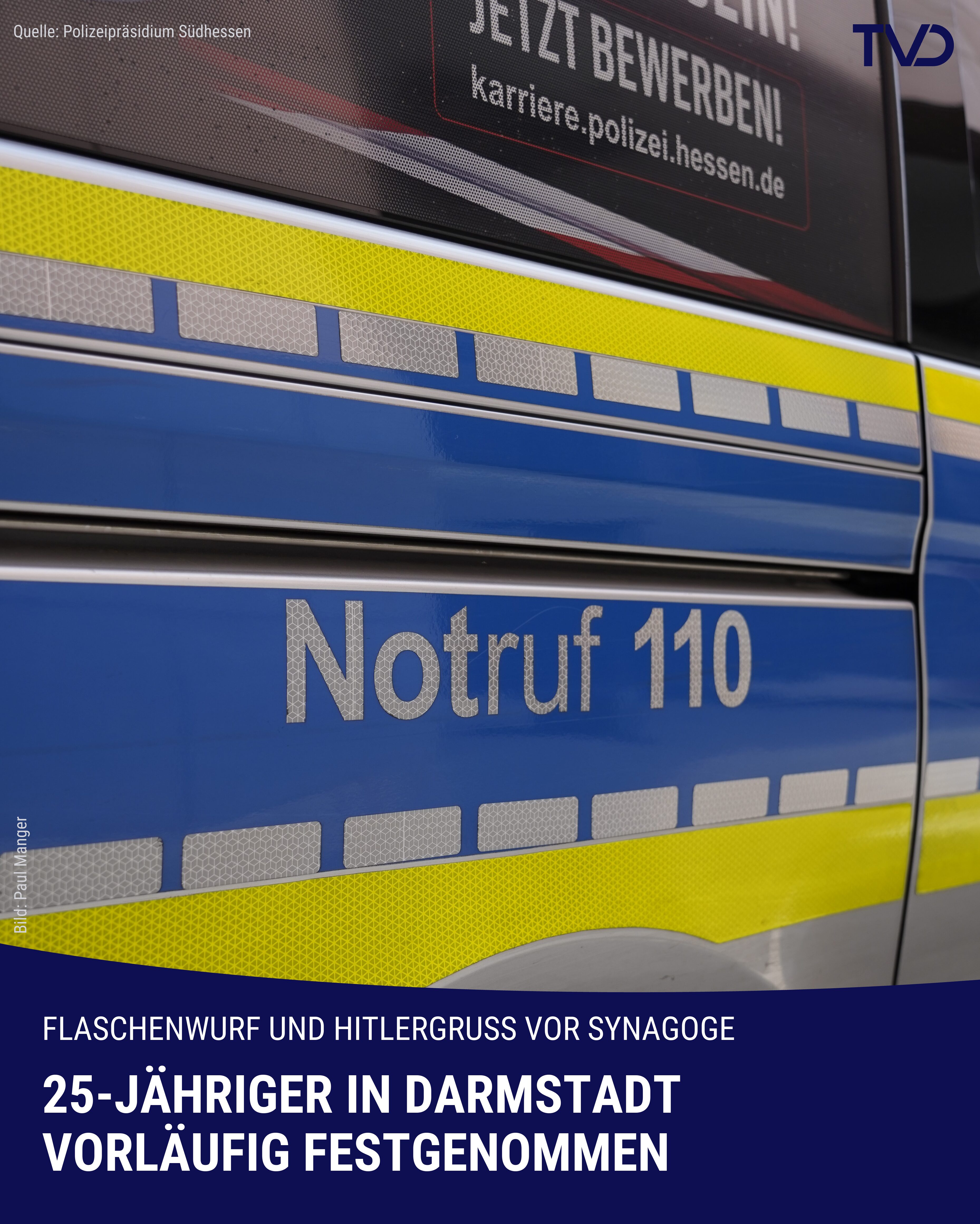 Nachdem ein Unbekannter eine Flasche gegen die Eingangstür der Darmstädter Synagoge geworfen hatte, konnte die Polizei nun einen 25-Jährigen festnehmen. Der Staatsschutz hat die Ermittlungen aufgenommen.