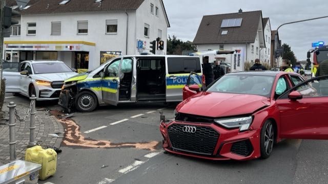 Auf der Südlichen Ringstraße in Langen ist am Freitag (27.) ein Polizeiwagen mit zwei Fahrzeugen kollidiert. Wie die Polizei mitteilt, waren die beiden 41- und 22-jährigen Beamten mit eingeschaltetem Blaulicht und Martinshorn auf dem Weg zu einer gemeldeten Schlägerei.