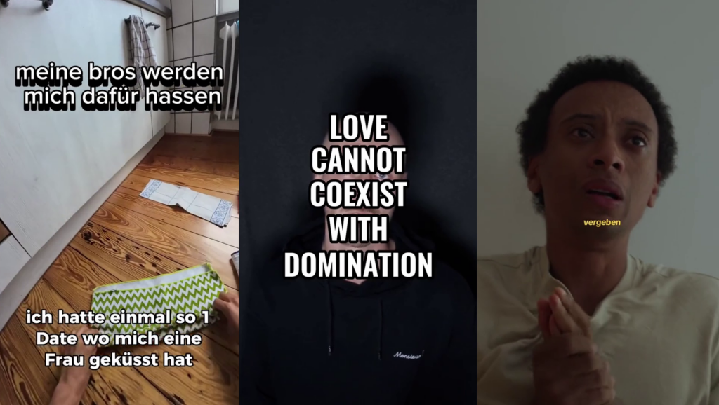 Ausgerechnet im Theater fanden sie eine Lösung für die Misere der Mannosphäre. Genauer im Kollektiv onlinetheater.live”. Drei Monate lang haben Kathi Kraft, Luzia Oppermann und Caspar Weimann untersucht, wie die Mannosphäre funktioniert. Mit Fakeprofilen auf TikTok haben sie die Methoden der Manfluencer analysiert, und mit drei eigenen Accounts Gegencontent erstellt. Die Machart ihrer Videos ist nahezu identisch: direkte Ansprache, aufgeregte Musik im Hintergrund, auf blumige Worte wird verzichtet. Das Besondere: anstatt Frauenhass waren die Botschaften der Kurzvideos, anderen zuzuhören, und ihnen mit Empathie zu begegnen. Da gibt es @wohin_von_hier, ein junger Mann, der aus einer Beziehung kommt, und das Publikum mitnimmt auf eine Reise zu seinen Gefühlen. Oder @alex.new.mindset, ein besagter “großer Bruder”, der direkt in die Kamera spricht und das Potential vom Miteinander erklärt. “Unsere Zielgruppe waren junge Männer zwischen 16 und 25, die am Anfang der Radikalisierung standen”, verrät Caspar Weimann. Das Ziel: die ewige Spirale in Rückzug, Frauenhass und Radikalisierung zu durchbrechen. Mit Erfolg! Am Ende der drei Monate standen über vier Millionen Aufrufe, fast 200.000 Likes und 4000 Kommentare. Das Projekt heißt “MYKE”, also eine Mischung aus dem Namen eines typischen, sinnsuchenden Jungen, und dem englischen Wort für Mikrofon.