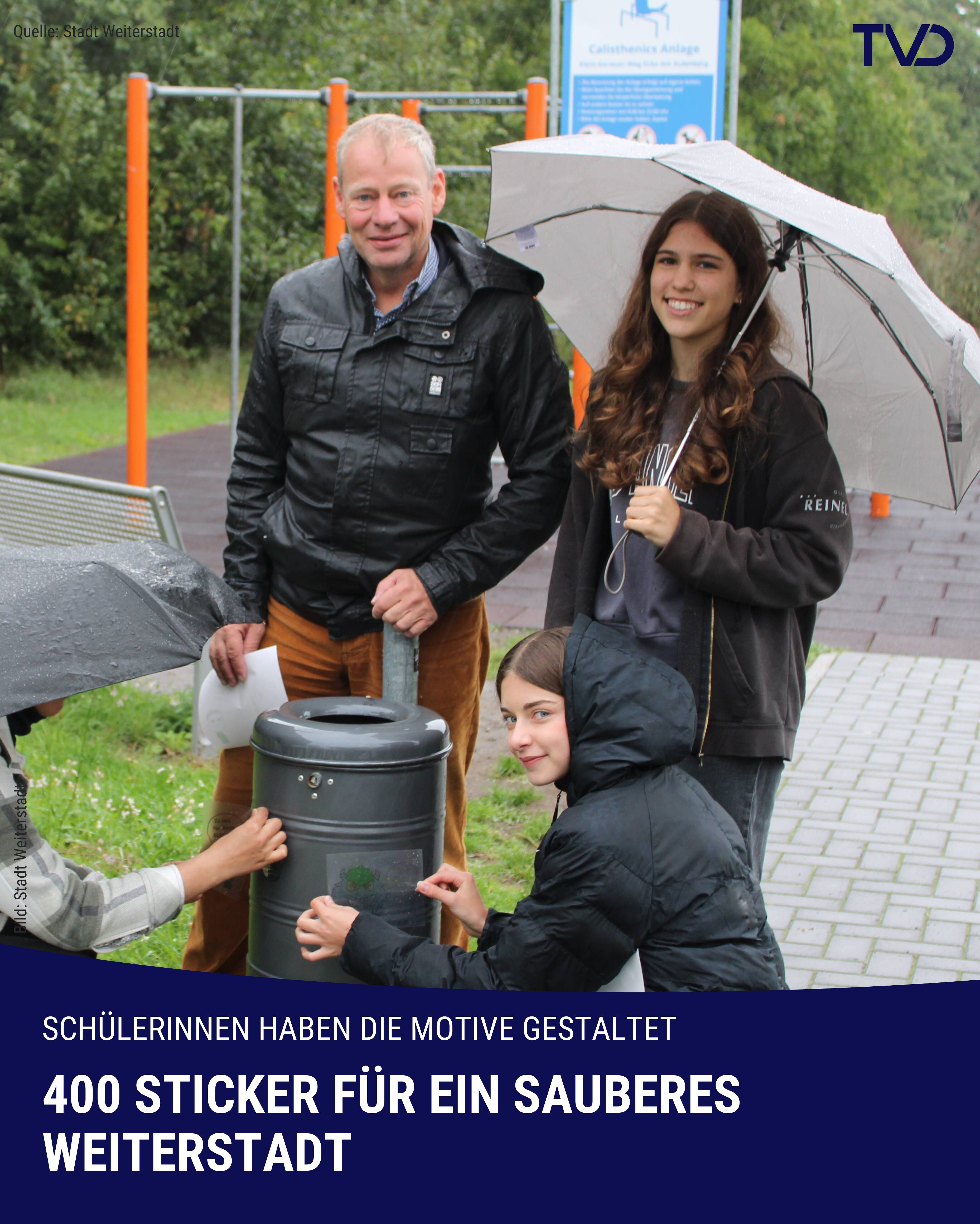 Der Stickerei vorangegangen, war der Schulwettbewerb „Kreative Sticker für ein sauberes Weiterstadt“ an der Albrecht-Dürer-Schule. Schülerinnen und Schüler konnten verschiedene Design für die späteren “Müllsticker” entwerfen und bei dem Wettbewerb einreichen. Die Jury aus Stadt und Schule hat sich schließlich für drei Motive entschieden. Die Gewinnerinnen und Gewinner konnten heute (24.09) ihre Sticker höchstpersönlich an einen Mülleimer anbringen. Mit dabei bei der ersten Klebeaktion Bürgermeister Ralf Möller: „Diese Sticker sind mehr als nur Dekoration. Sie stehen für Kreativität, Mitgestaltung und ein starkes Zeichen junger Menschen für mehr Sauberkeit im öffentlichen Raum.”